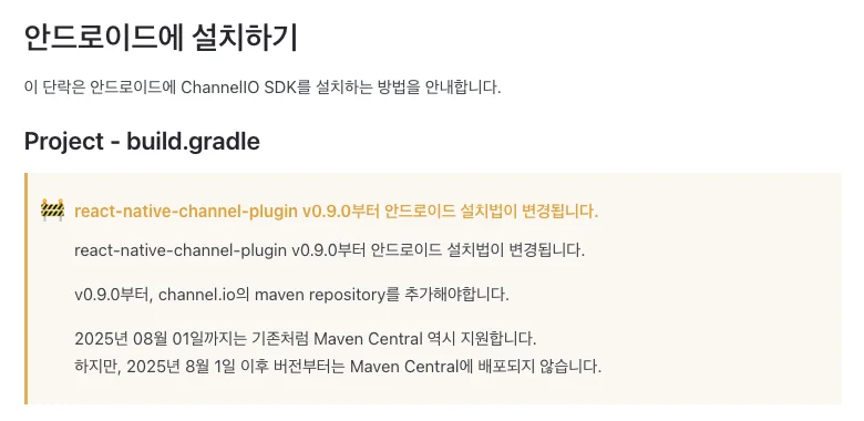 문제 해결을 위해 Channel Talk 공식 문서를 확인해보니, v0.9.0부터 설치 방법이 크게 변경되었다는 것을 발견했다. 특히 Maven repository 설정에 중요한 변화가 있었다.